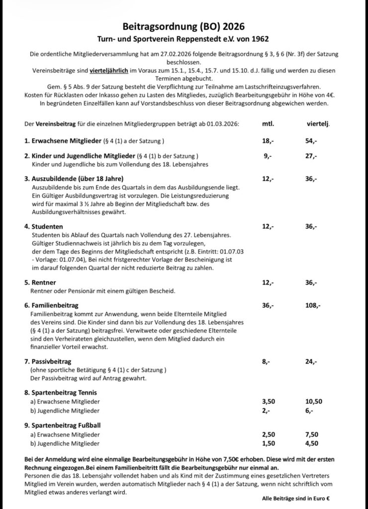 Die Bearbeitungsgebühr betrifft ausschließlich neue Mitglieder, die nach dem 01.03.2026 dem TuS Reppenstedt beitreten. Eine rückwirkende Erhebung der Gebühr ist nicht vorgesehen.